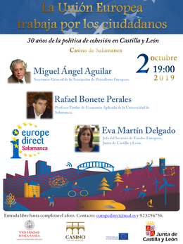 El miércoles, 2 de octubre, a las 19:00h. tuvo lugar la mesa redonda: “La Unión Europea trabaja por mí: 30 años de éxito de la política de cohesión”, en el Patio Neorrenacentista del Palacio de Figueroa (Casino de Salamanca).